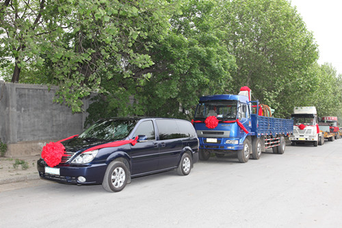 随後,在禮炮聲中,裝載着大型設備的車隊,駛向大連寶原新廠區。