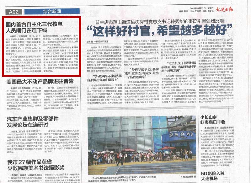 《大連日報》在2025年12月4日 A02版,以“國内首台自主化三代核🐅電人員閘門在連下線”為标題對大連寶原核設備🔱有限🔅公司“自主化非能動系列核電廠人員閘門樣💃機”成果鑒定會進行了報道。原文轉載如下: