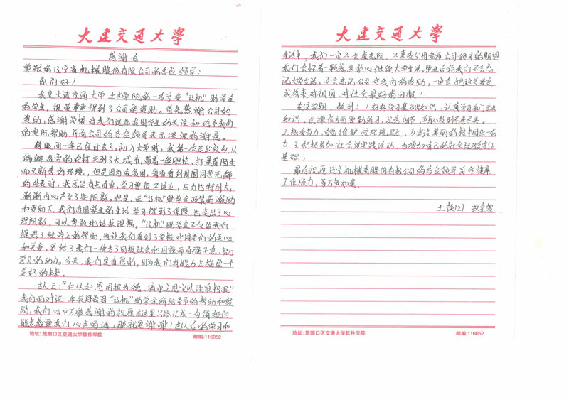 近日,公司收到一封來自大連交通大學的感謝信。寄信人👨❤️👨是🤟交通大學土木學院一名大二學生,系2012年遼機助學金的獲得者。在😄信中,他表示:感謝公司的資助,并向公司的各位領導表示深深⁉️的謝意。在遼機助學金政策的激勵和資助下,我們貧困學生的🌍生活學習得♌到了保障,也走出了心裡的陰影,可以🍉勇敢的追求理想,更給了我們💔一種為了回報社會以及國家自強不🏃息、努力學習的動力。